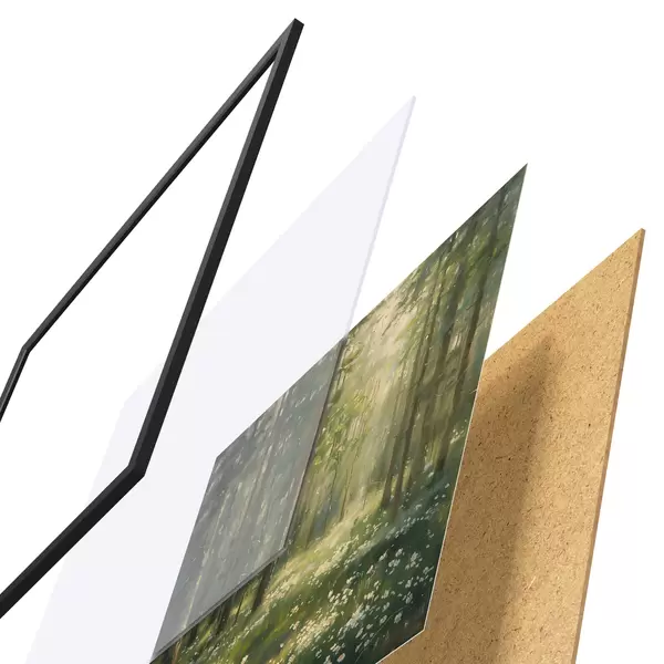 El póster consta de marco, plexiglás, imagen impresa y soporte de aglomerado. El póster puede colgarse inmediatamente en la pared gracias a los soportes de la parte posterior.