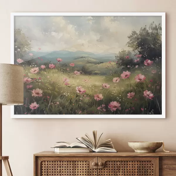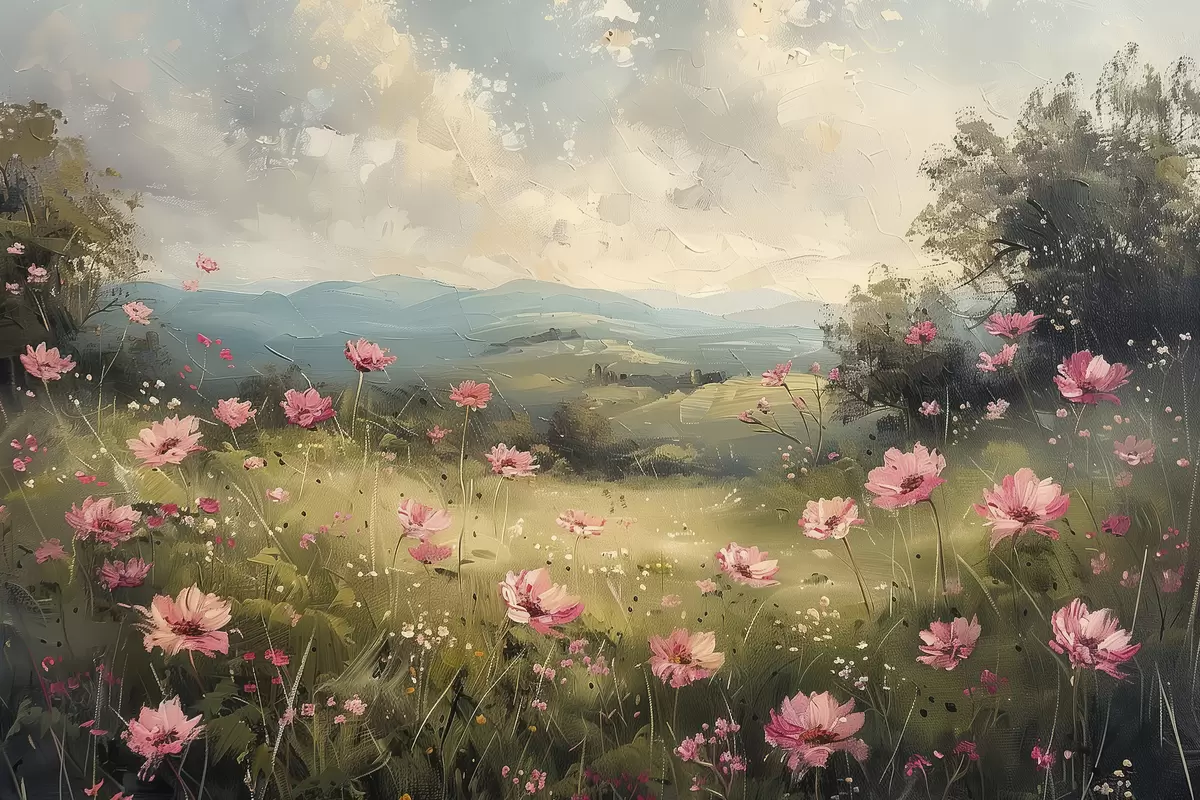 Poster Prado con flores rosas, hierba verde, paisaje natural, cielo con nubes, dibujo acrílico Nr f40234