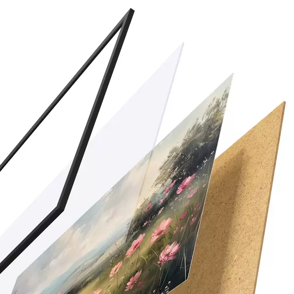 El póster consta de marco, plexiglás, imagen impresa y soporte de aglomerado. El póster puede colgarse inmediatamente en la pared gracias a los soportes de la parte posterior.
