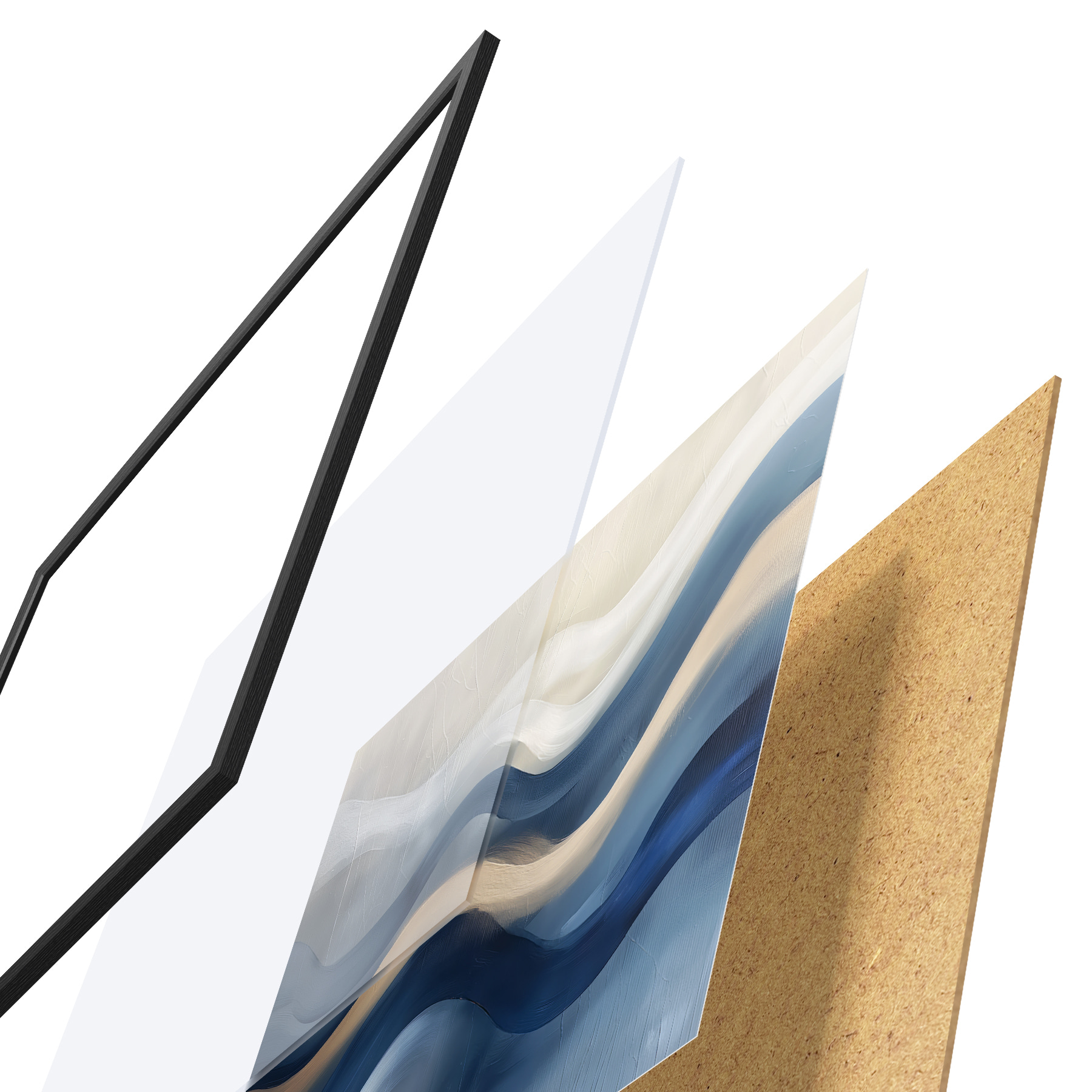 El póster consta de marco, plexiglás, imagen impresa y soporte de aglomerado. El póster puede colgarse inmediatamente en la pared gracias a los soportes de la parte posterior.