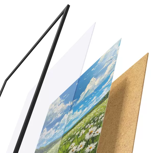 El póster consta de marco, plexiglás, imagen impresa y soporte de aglomerado. El póster puede colgarse inmediatamente en la pared gracias a los soportes de la parte posterior.