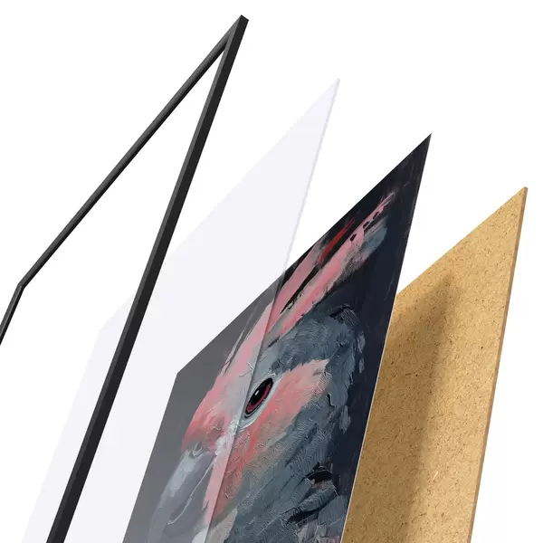 El póster consta de marco, plexiglás, imagen impresa y soporte de aglomerado. El póster puede colgarse inmediatamente en la pared gracias a los soportes de la parte posterior.