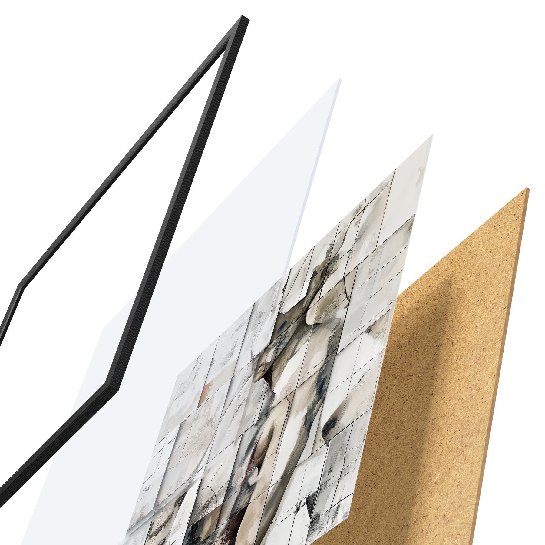 El póster consta de marco, plexiglás, imagen impresa y soporte de aglomerado. El póster puede colgarse inmediatamente en la pared gracias a los soportes de la parte posterior.