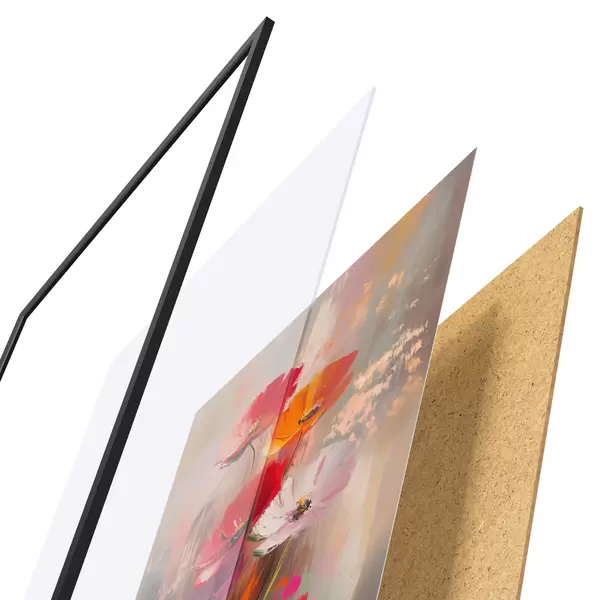 El póster consta de marco, plexiglás, imagen impresa y soporte de aglomerado. El póster puede colgarse inmediatamente en la pared gracias a los soportes de la parte posterior.