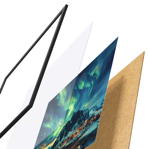 El póster consta de marco, plexiglás, imagen impresa y soporte de aglomerado. El póster puede colgarse inmediatamente en la pared gracias a los soportes de la parte posterior.