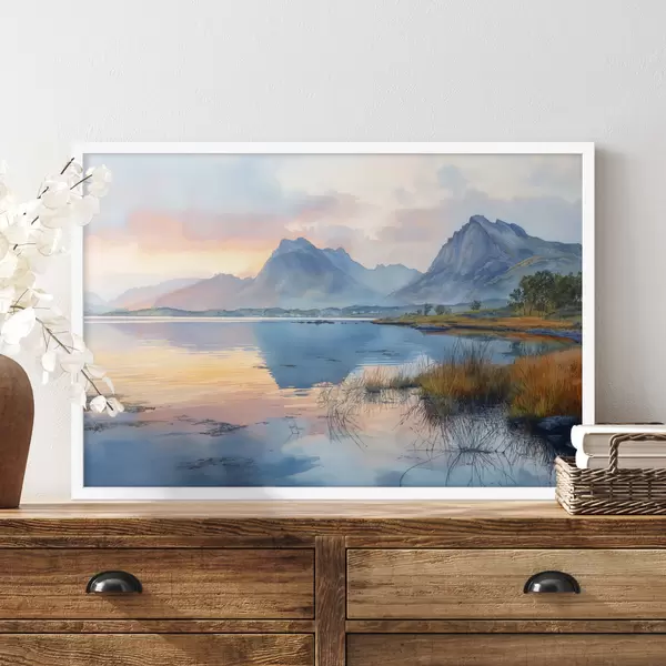 Poster Río tranquilo con montañas, amanecer, colores suaves Nr f40307