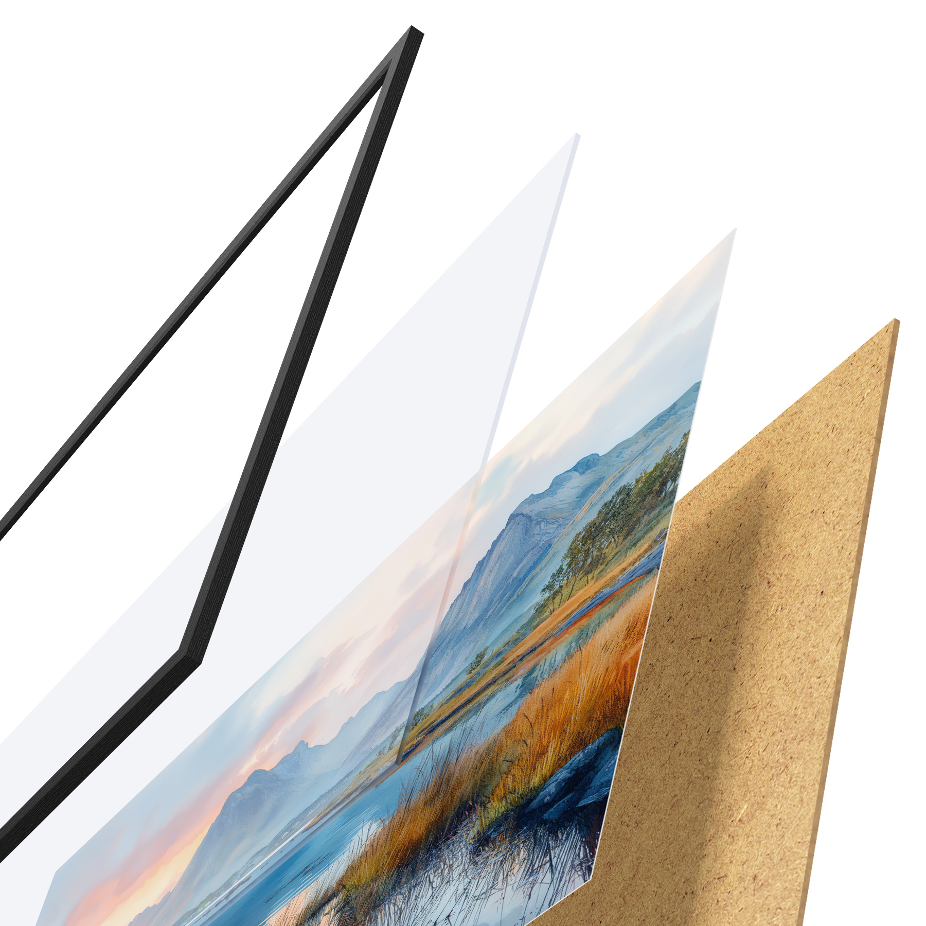 El póster consta de marco, plexiglás, imagen impresa y soporte de aglomerado. El póster puede colgarse inmediatamente en la pared gracias a los soportes de la parte posterior.