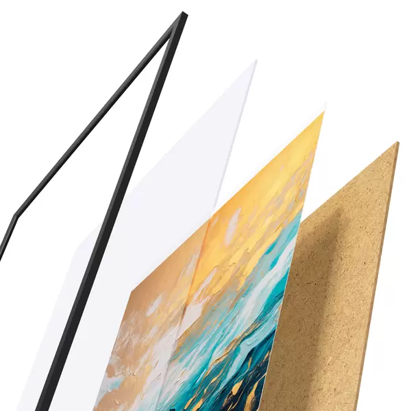 El póster consta de marco, plexiglás, imagen impresa y soporte de aglomerado. El póster puede colgarse inmediatamente en la pared gracias a los soportes de la parte posterior.