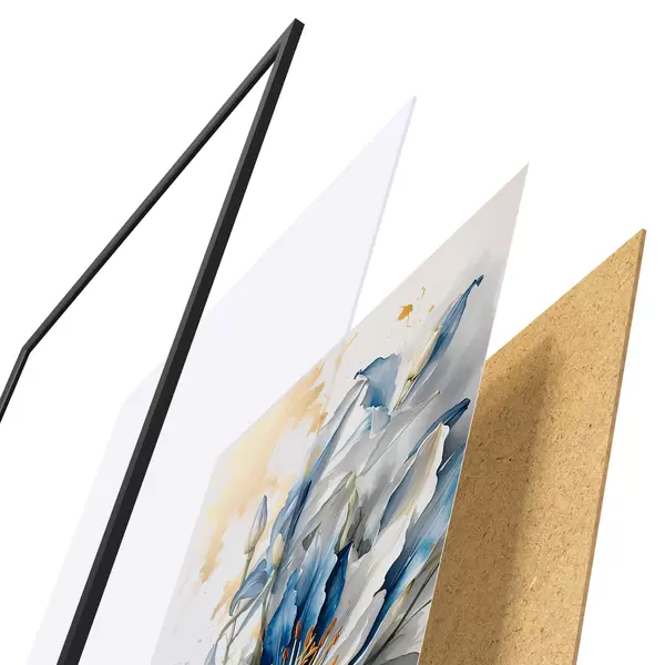 El póster consta de marco, plexiglás, imagen impresa y soporte de aglomerado. El póster puede colgarse inmediatamente en la pared gracias a los soportes de la parte posterior.