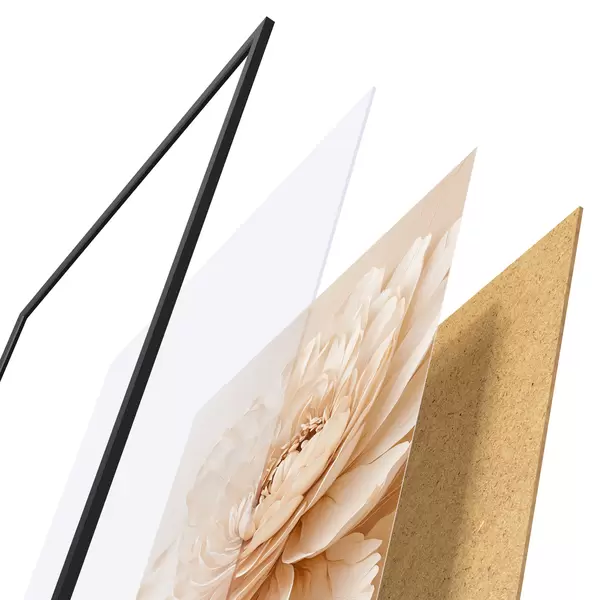El póster consta de marco, plexiglás, imagen impresa y soporte de aglomerado. El póster puede colgarse inmediatamente en la pared gracias a los soportes de la parte posterior.