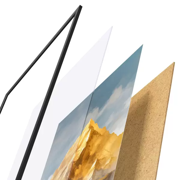 El póster consta de marco, plexiglás, imagen impresa y soporte de aglomerado. El póster puede colgarse inmediatamente en la pared gracias a los soportes de la parte posterior.