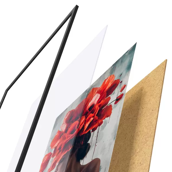 El póster consta de marco, plexiglás, imagen impresa y soporte de aglomerado. El póster puede colgarse inmediatamente en la pared gracias a los soportes de la parte posterior.