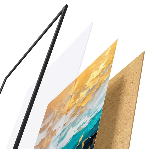 El póster consta de marco, plexiglás, imagen impresa y soporte de aglomerado. El póster puede colgarse inmediatamente en la pared gracias a los soportes de la parte posterior.