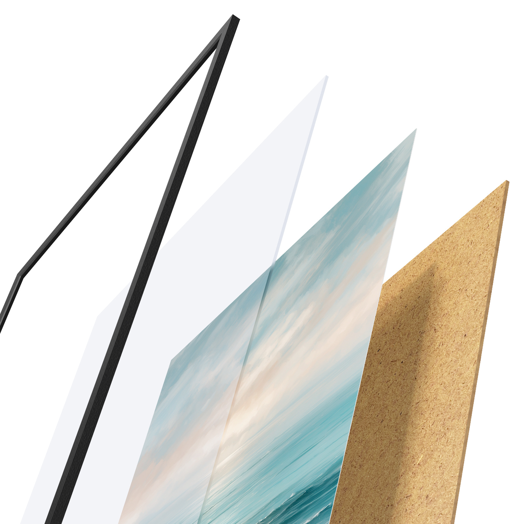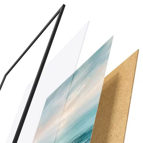 El póster consta de marco, plexiglás, imagen impresa y soporte de aglomerado. El póster puede colgarse inmediatamente en la pared gracias a los soportes de la parte posterior.