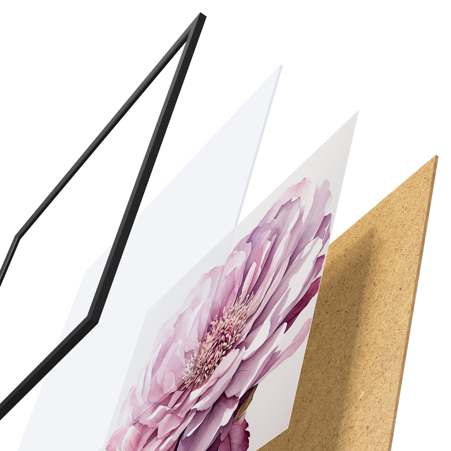 El póster consta de marco, plexiglás, imagen impresa y soporte de aglomerado. El póster puede colgarse inmediatamente en la pared gracias a los soportes de la parte posterior.