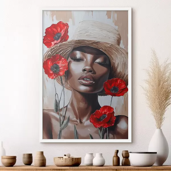 Poster Retrato de una mujer con sombrero con amapolas rojas Nr f40350