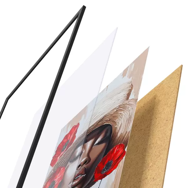 El póster consta de marco, plexiglás, imagen impresa y soporte de aglomerado. El póster puede colgarse inmediatamente en la pared gracias a los soportes de la parte posterior.