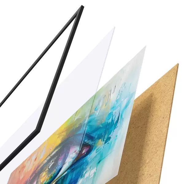 El póster consta de marco, plexiglás, imagen impresa y soporte de aglomerado. El póster puede colgarse inmediatamente en la pared gracias a los soportes de la parte posterior.