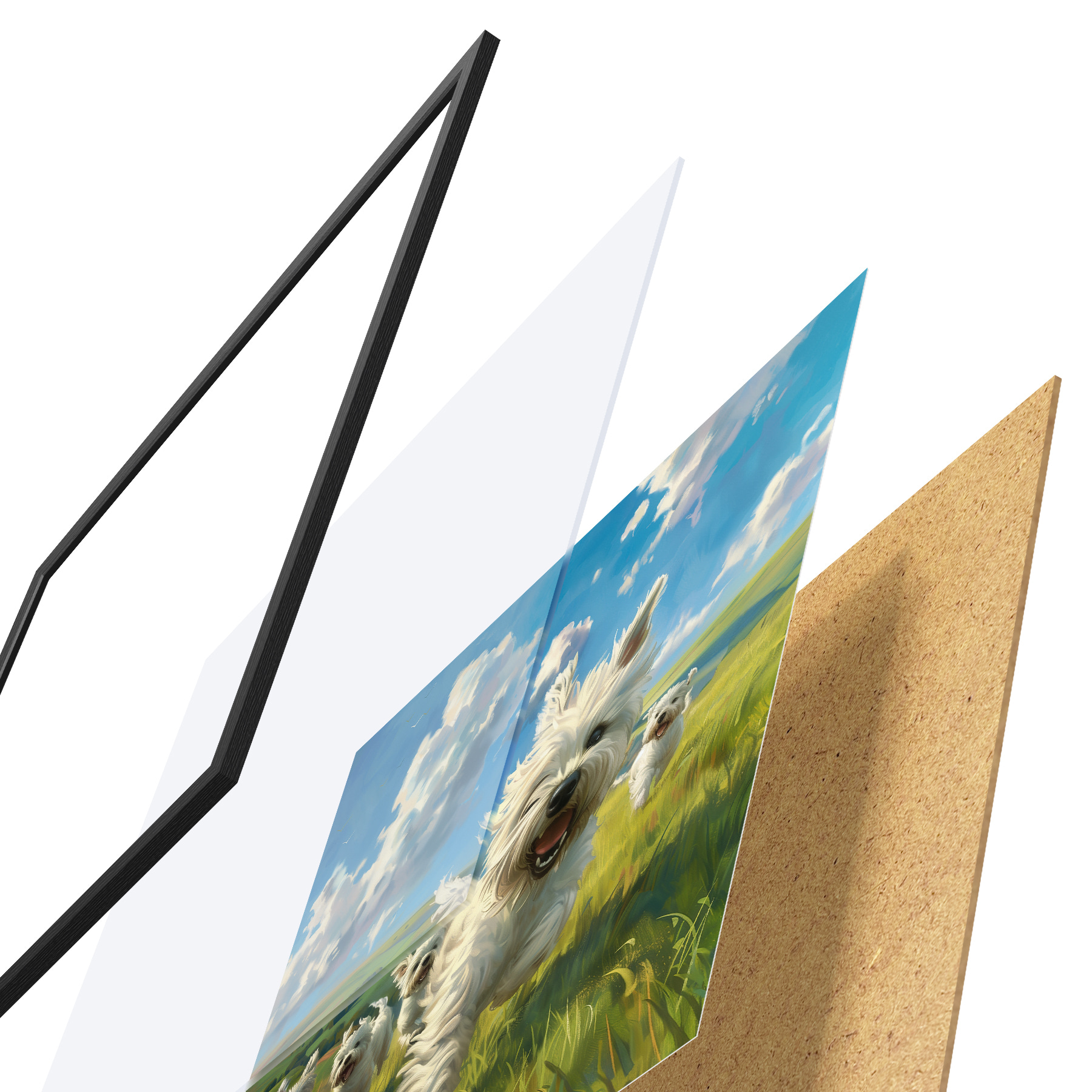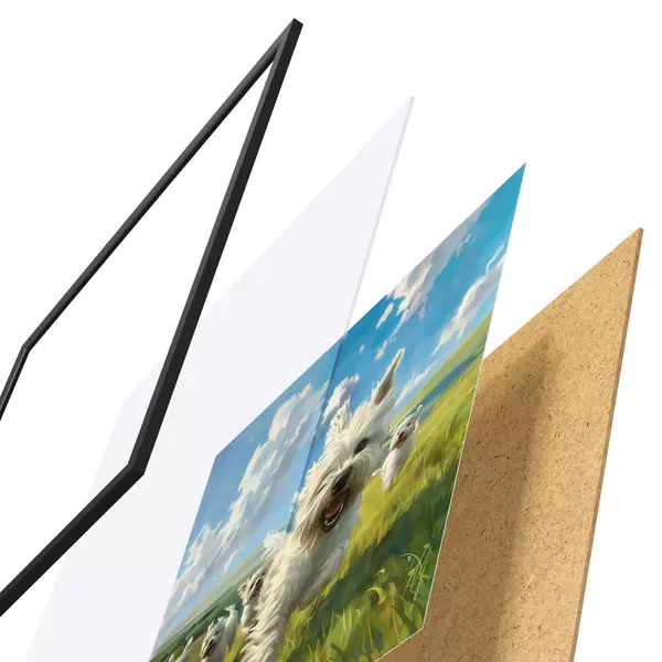 El póster consta de marco, plexiglás, imagen impresa y soporte de aglomerado. El póster puede colgarse inmediatamente en la pared gracias a los soportes de la parte posterior.