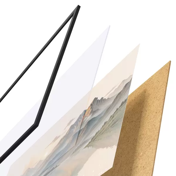El póster consta de marco, plexiglás, imagen impresa y soporte de aglomerado. El póster puede colgarse inmediatamente en la pared gracias a los soportes de la parte posterior.