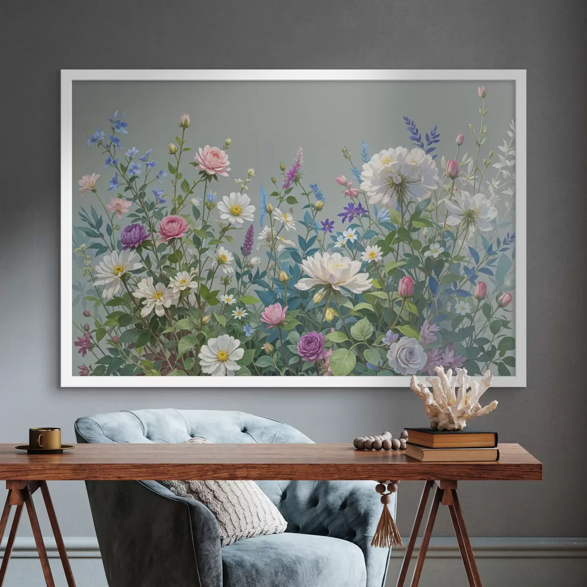 Poster Un jardín exuberante y vibrante lleno de una variedad de flores coloridas y plantas florecientes sobre un fondo gris. f40393