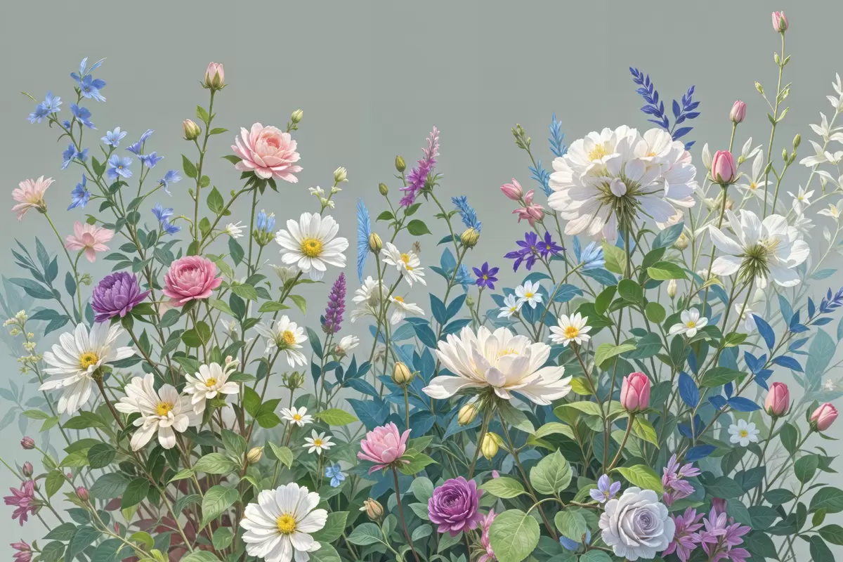 Poster Un jardín exuberante y vibrante lleno de una variedad de flores coloridas y plantas florecientes sobre un fondo gris. Nr f40393