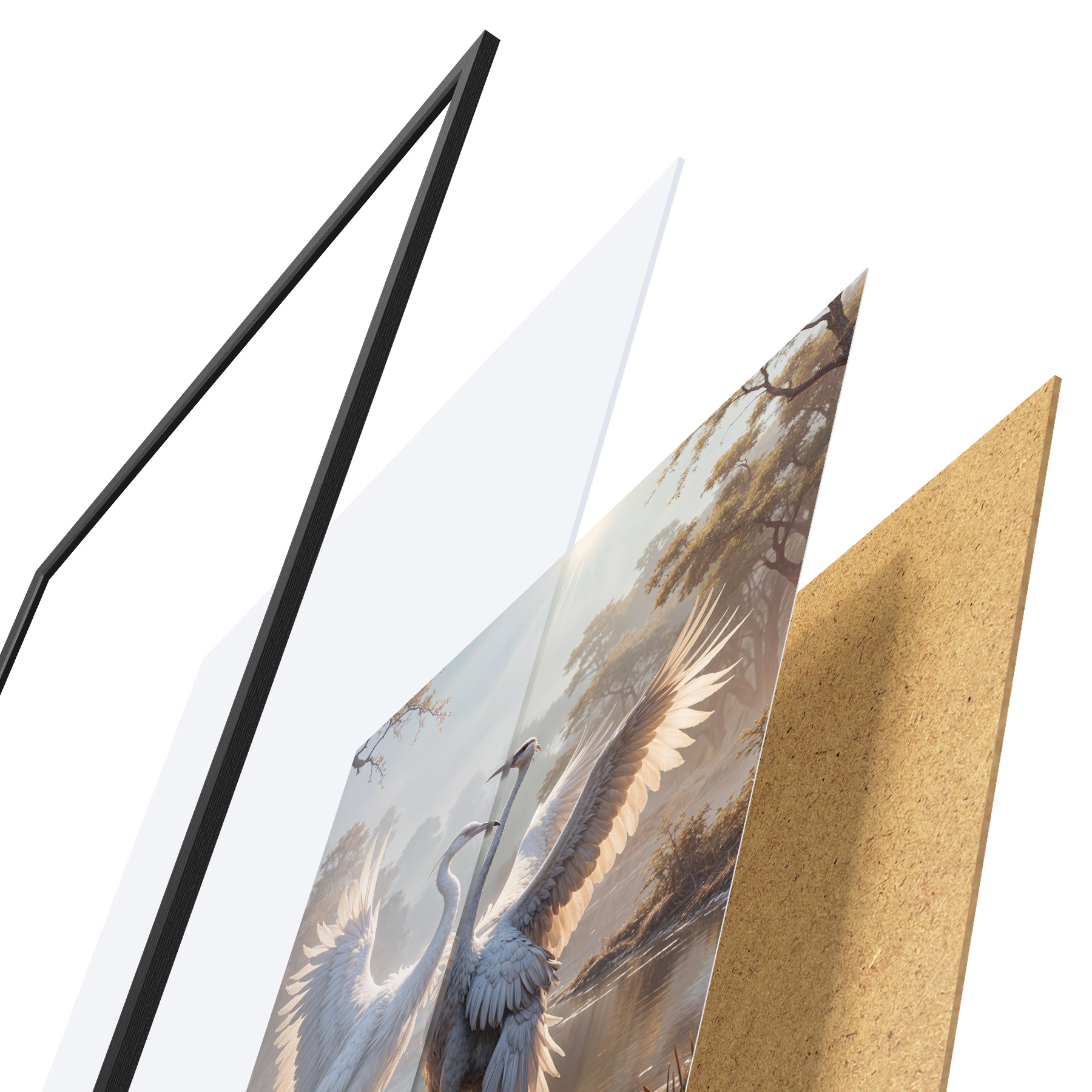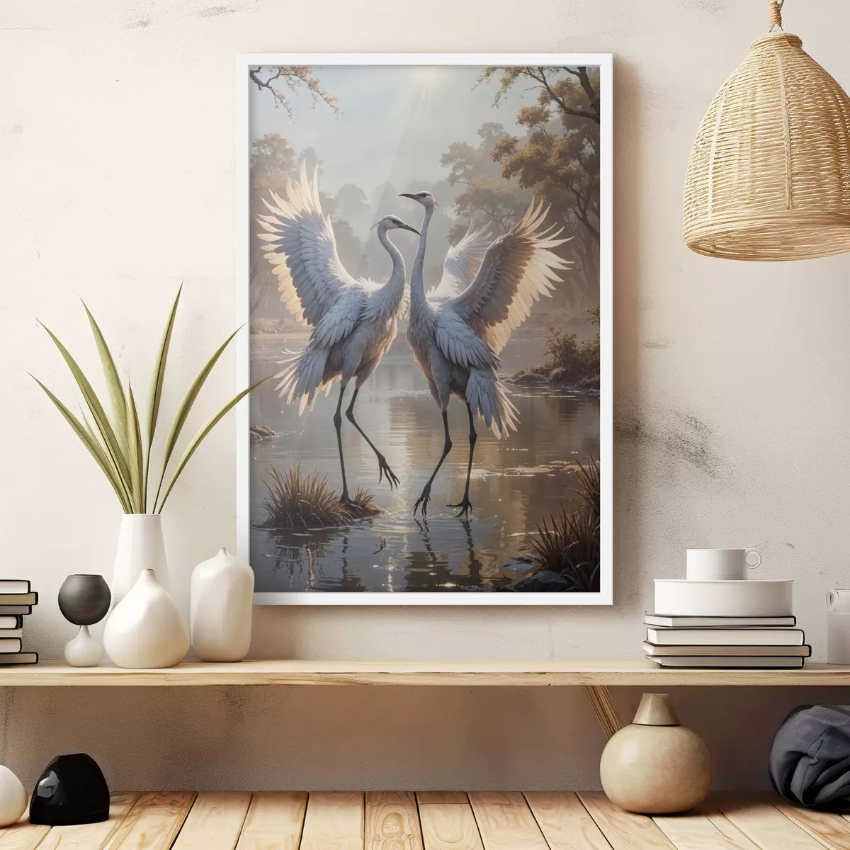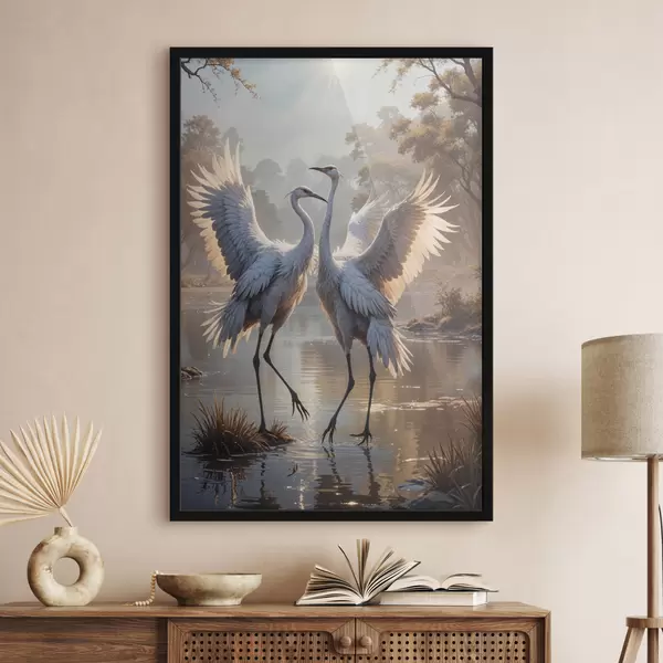 Poster Dos grandes grullas grises con cuellos largos y alas extendidas de pie en un lago brumoso rodeado de árboles. Nr f40404