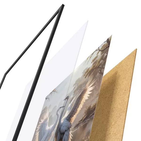 El póster consta de marco, plexiglás, imagen impresa y soporte de aglomerado. El póster puede colgarse inmediatamente en la pared gracias a los soportes de la parte posterior.