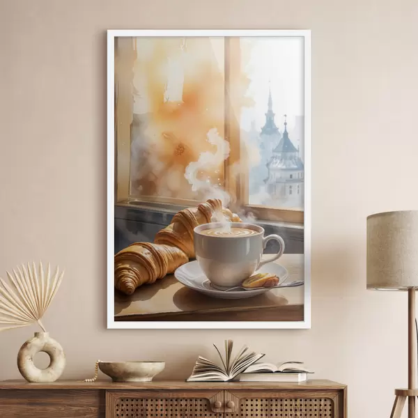 Poster Una taza de café caliente con vapor elevándose, colocada sobre una mesa junto a un croissant, con vista a un edificio histórico. f40405