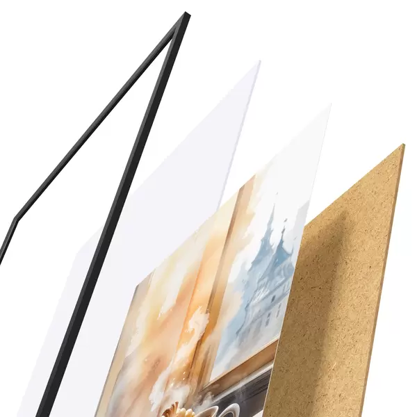 El póster consta de marco, plexiglás, imagen impresa y soporte de aglomerado. El póster puede colgarse inmediatamente en la pared gracias a los soportes de la parte posterior.