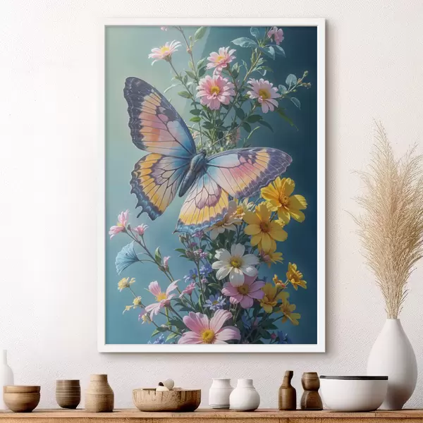 Poster Una mariposa grande y colorida posada en un ramo de flores rosas y amarillas sobre un fondo verde oscuro. Nr f40411