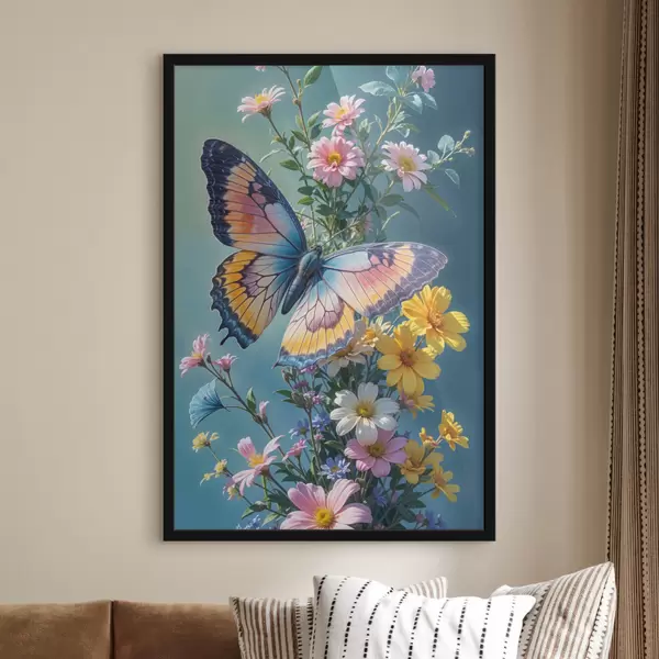 Poster Una mariposa grande y colorida posada en un ramo de flores rosas y amarillas sobre un fondo verde oscuro. f40411