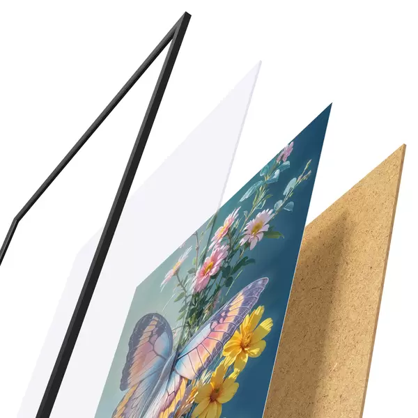 El póster consta de marco, plexiglás, imagen impresa y soporte de aglomerado. El póster puede colgarse inmediatamente en la pared gracias a los soportes de la parte posterior.