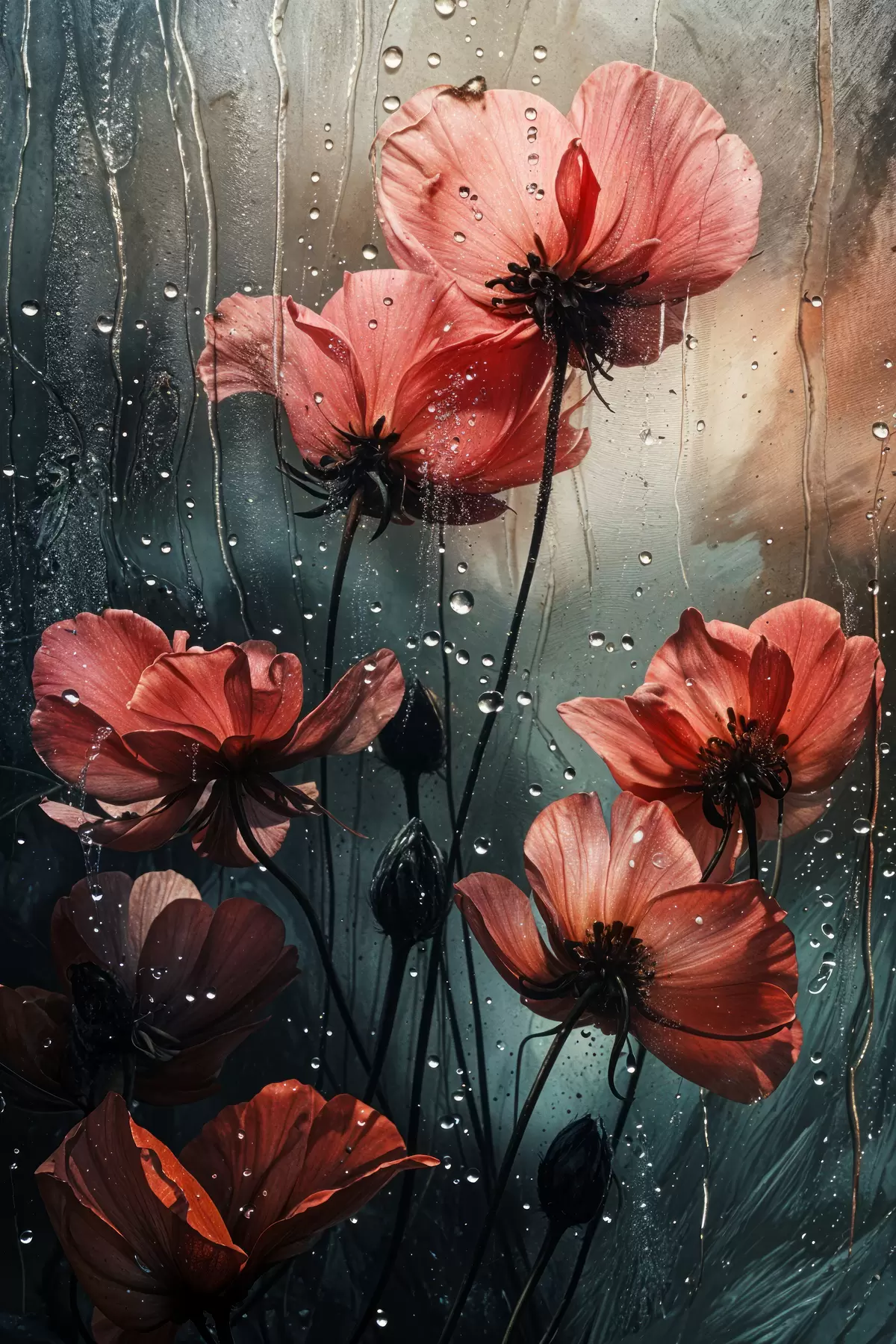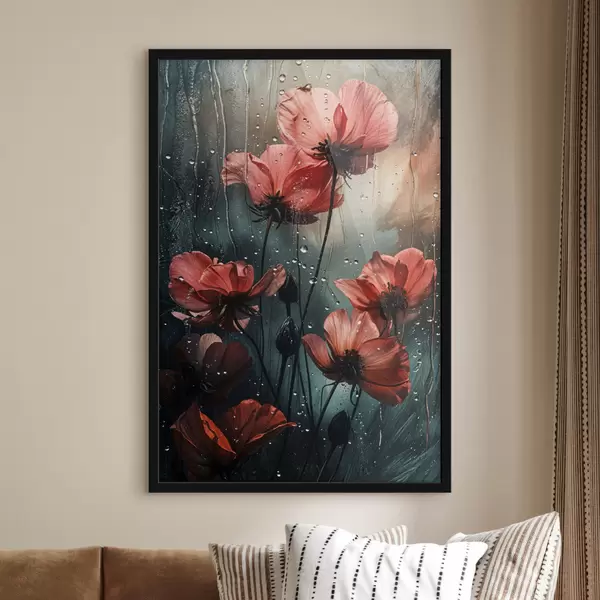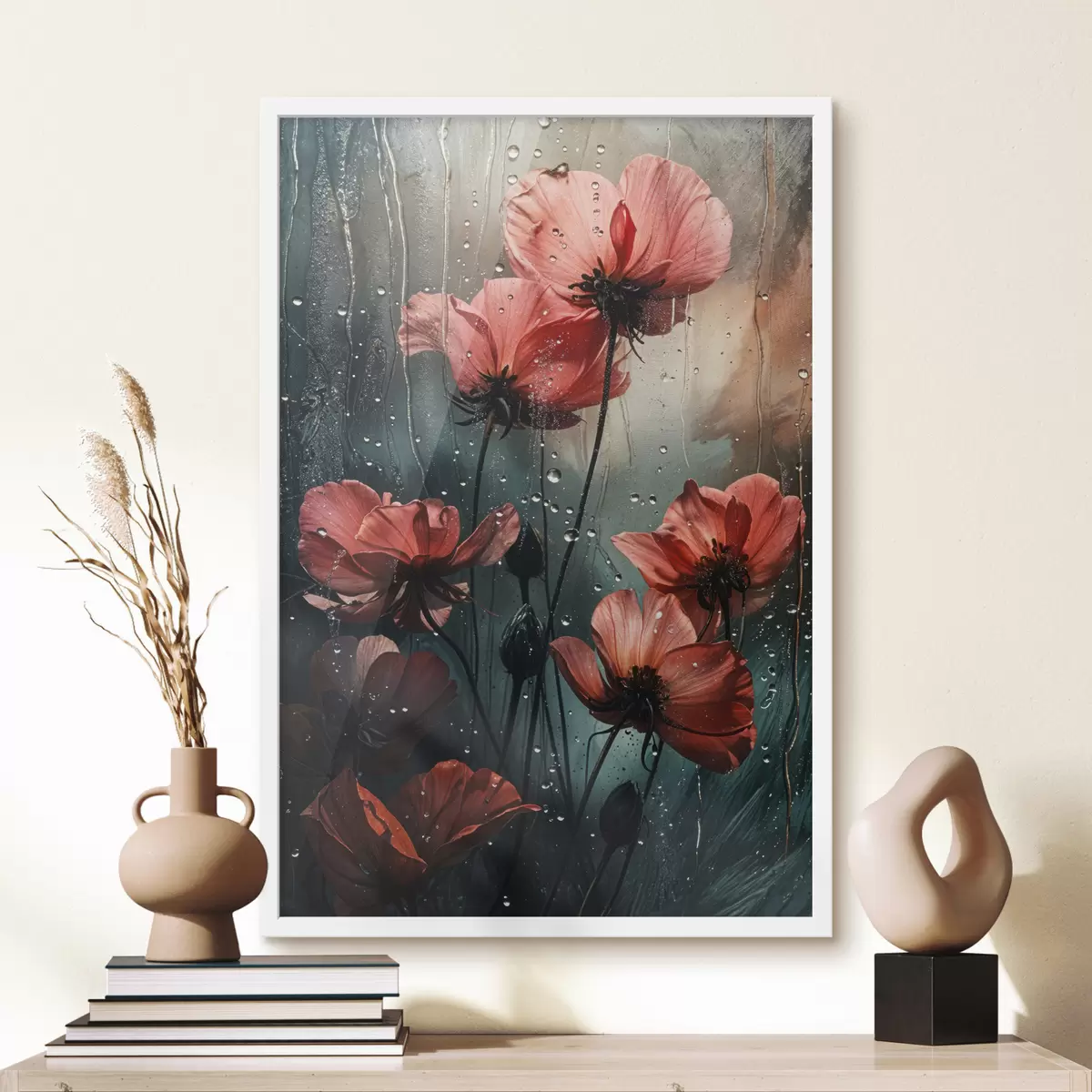 Poster Flores rojas con gotas de agua sobre un fondo borroso Nr f40412