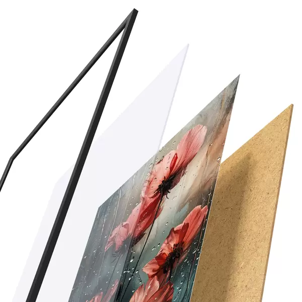 El póster consta de marco, plexiglás, imagen impresa y soporte de aglomerado. El póster puede colgarse inmediatamente en la pared gracias a los soportes de la parte posterior.
