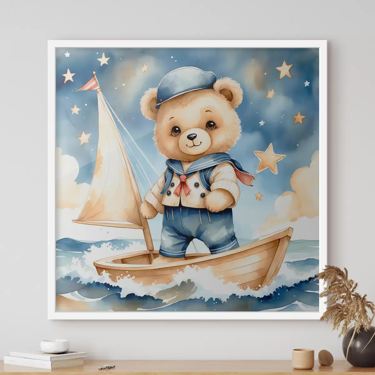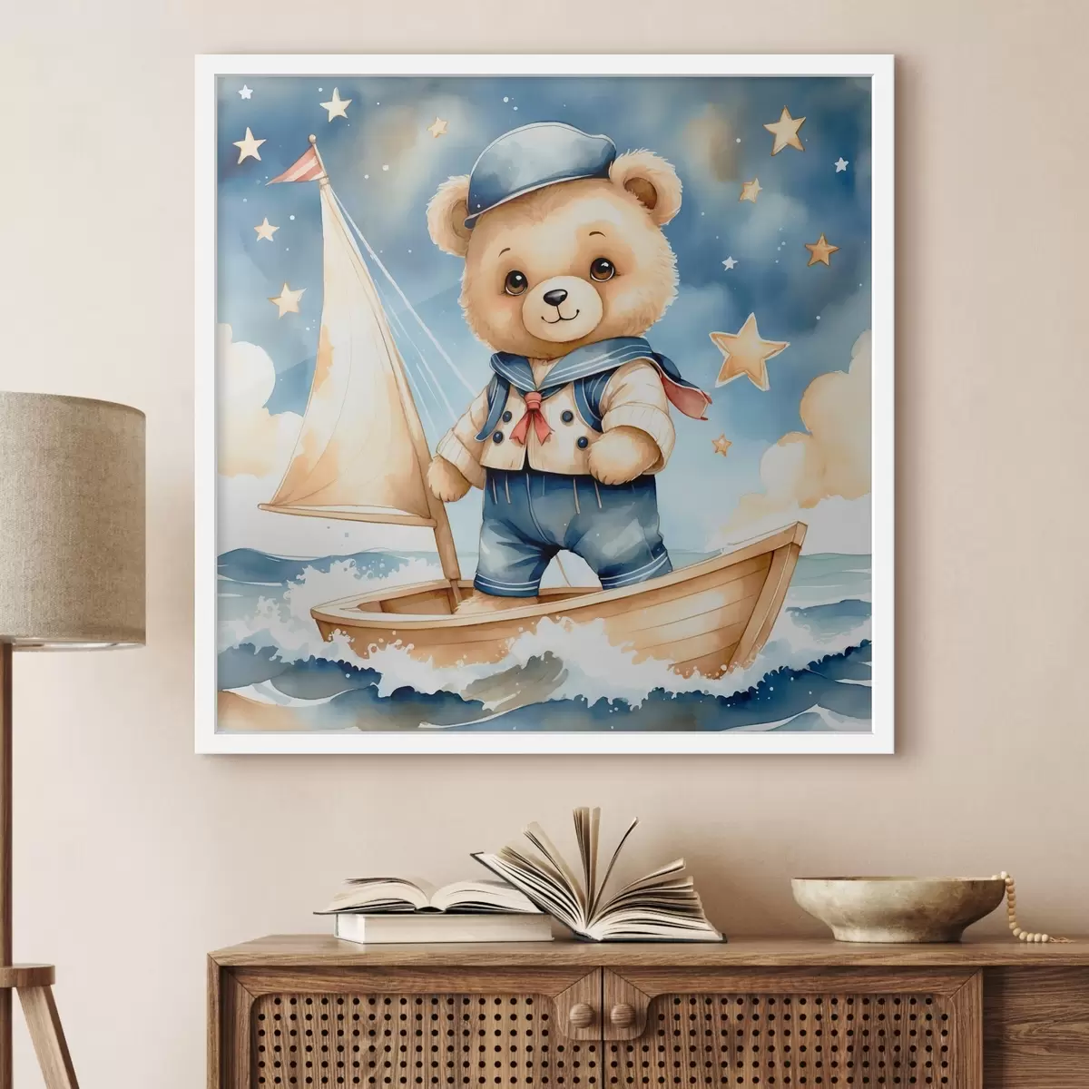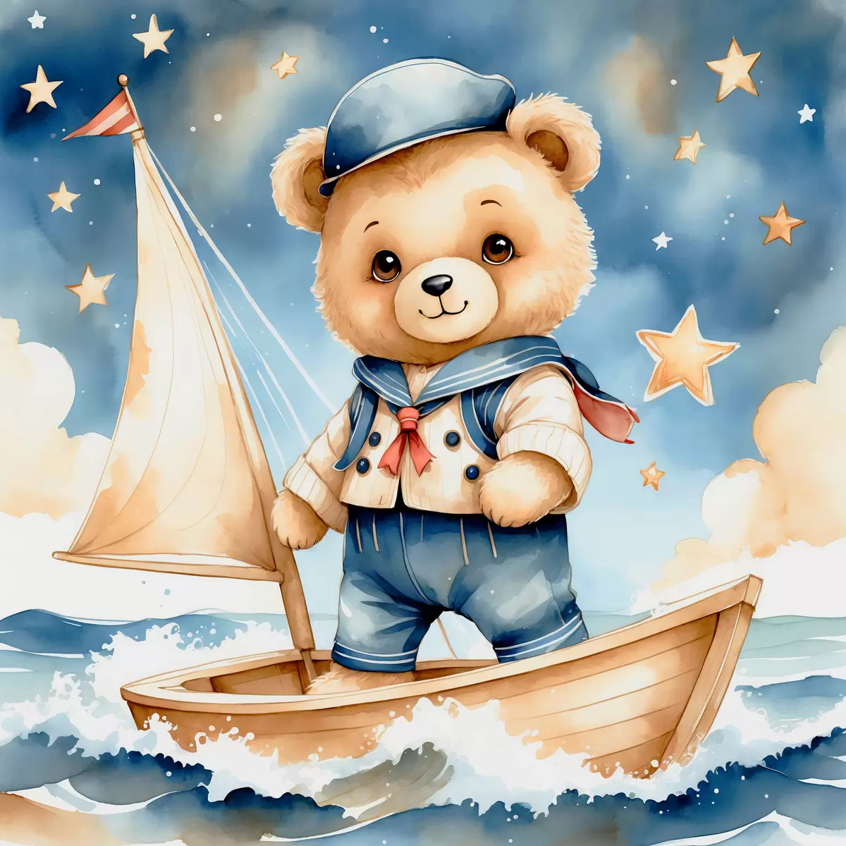 Poster Un simpático osito de peluche en acuarela en un barco con estrellas en el cielo f40429