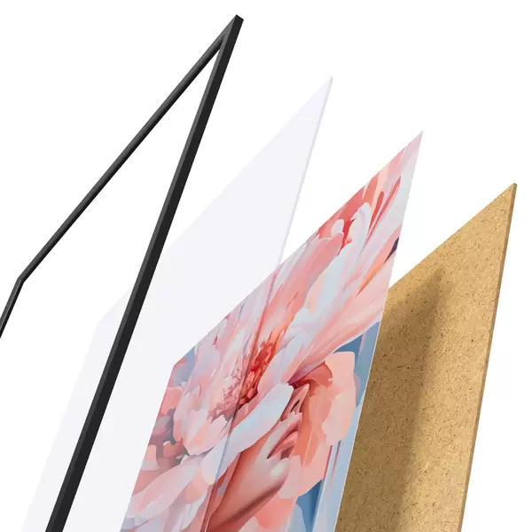 El póster consta de marco, plexiglás, imagen impresa y soporte de aglomerado. El póster puede colgarse inmediatamente en la pared gracias a los soportes de la parte posterior.