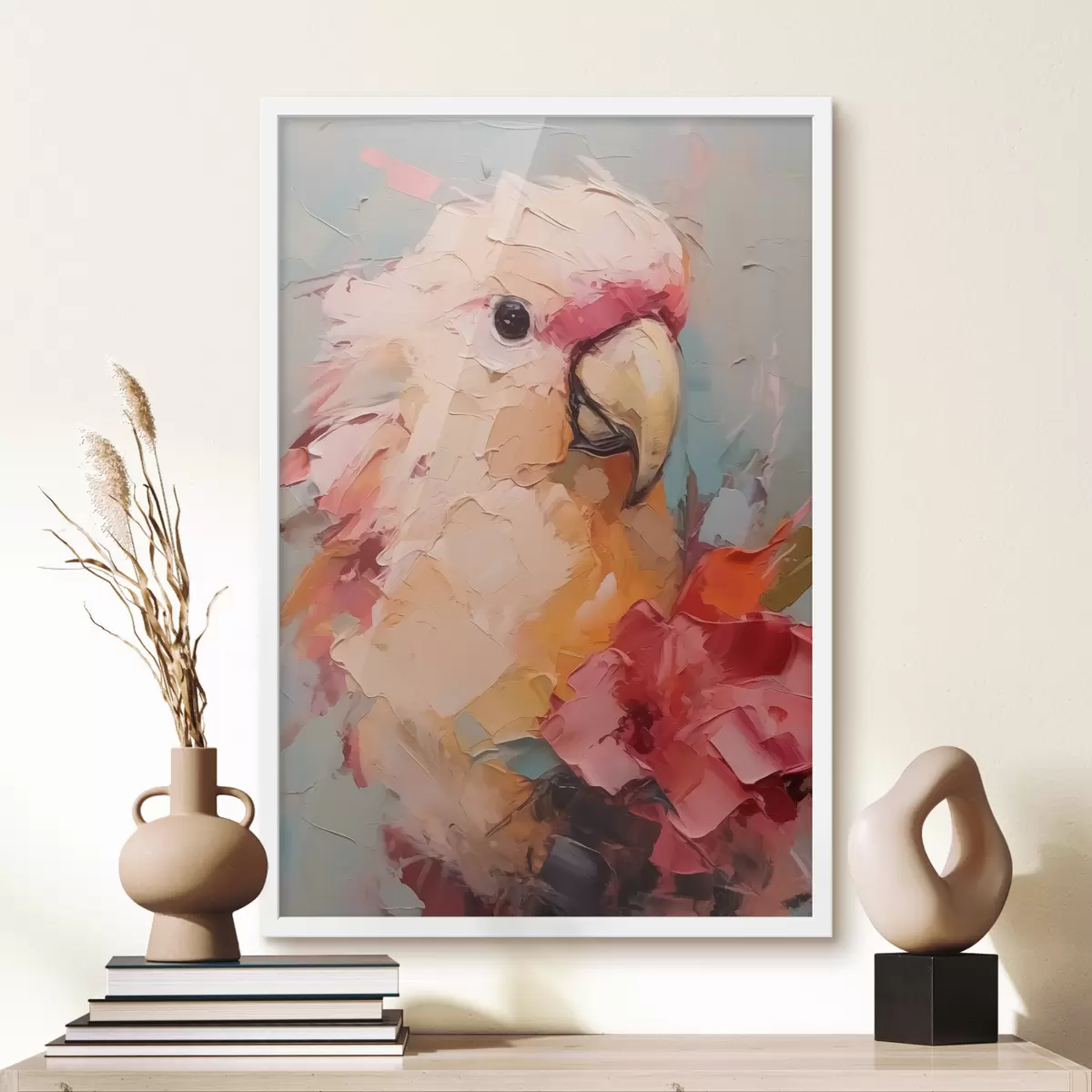 Poster Retrato de un loro cacatúa, color rosa, rojo, beige y gris. Nr f40525