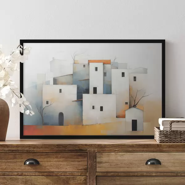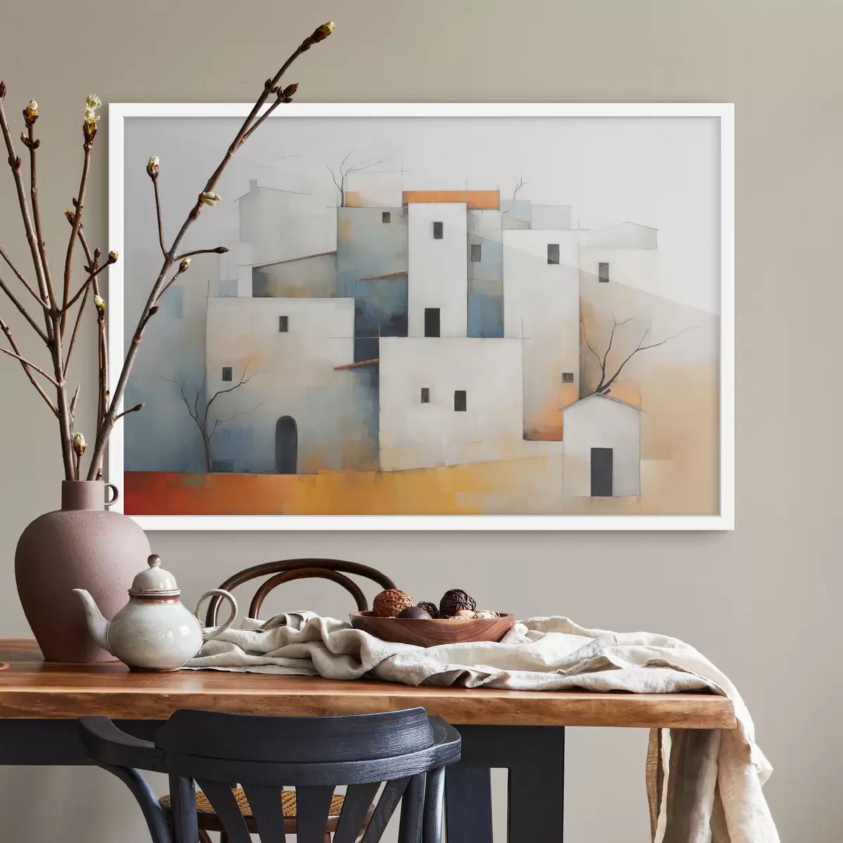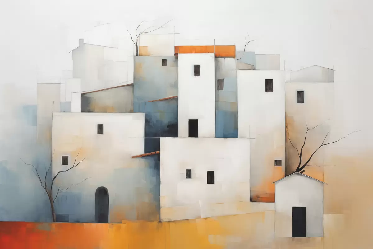 Poster Casas estilizadas blancas abstractas, color rojo, naranja, amarillo, azul. f40531