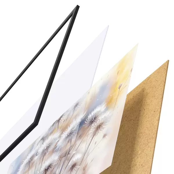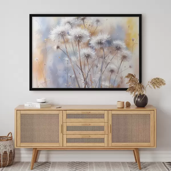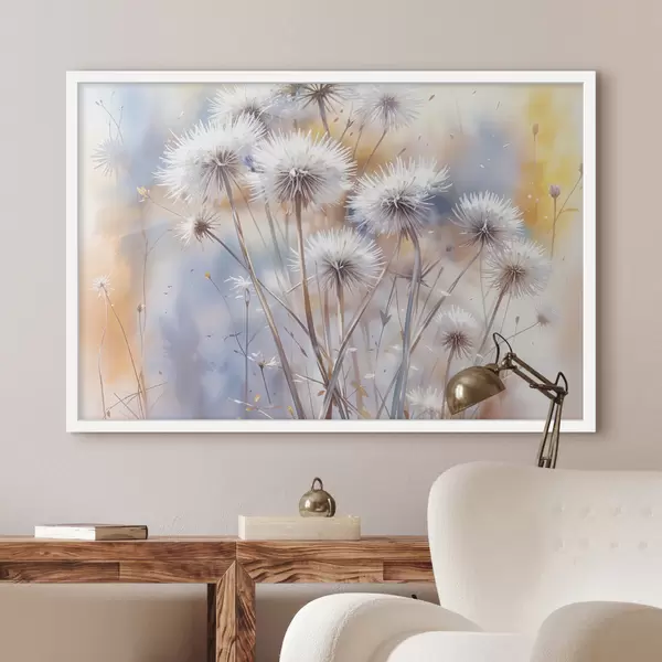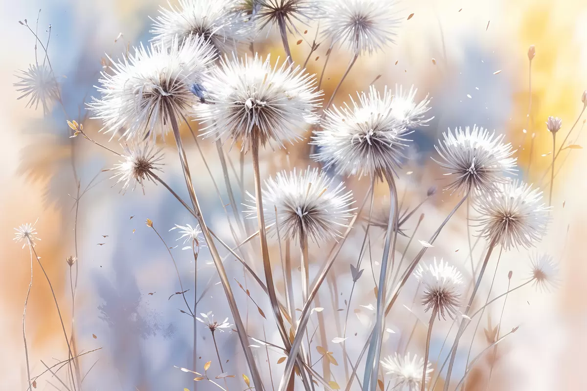 Poster Flores de diente de león blancas y esponjosas sobre un fondo de acuarela borroso con iluminación cálida Nr f40541