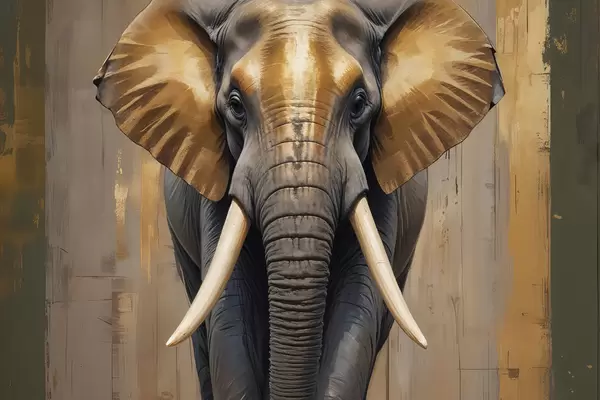Poster Una gran pintura texturizada de un elefante africano con colmillos de marfil y orejas ensanchadas, sobre un fondo de madera. Nr f40544