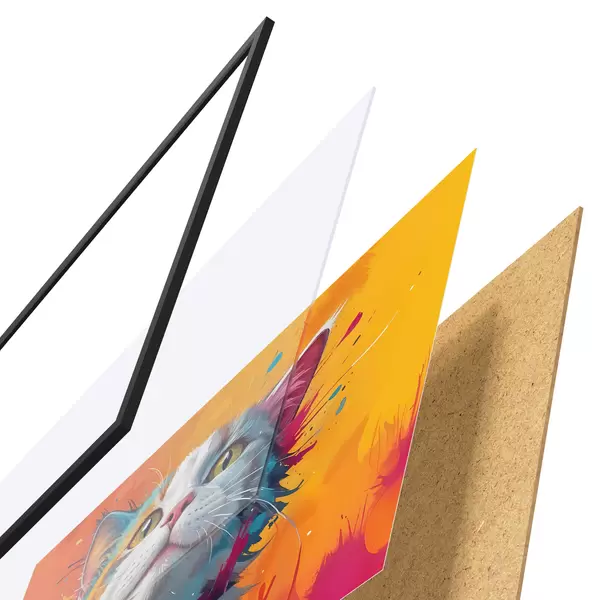 El póster consta de marco, plexiglás, imagen impresa y soporte de aglomerado. El póster puede colgarse inmediatamente en la pared gracias a los soportes de la parte posterior.
