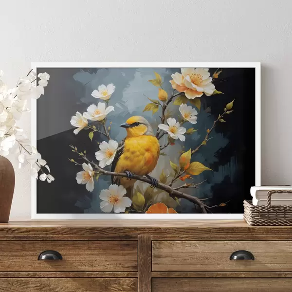 Poster Un pájaro amarillo posado en una rama con flores blancas y naranjas en el fondo. f40550
