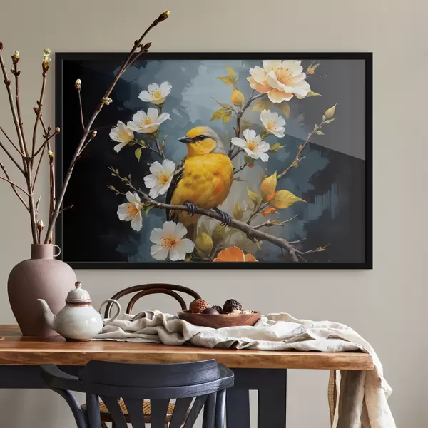 Poster Un pájaro amarillo posado en una rama con flores blancas y naranjas en el fondo. Nr f40550