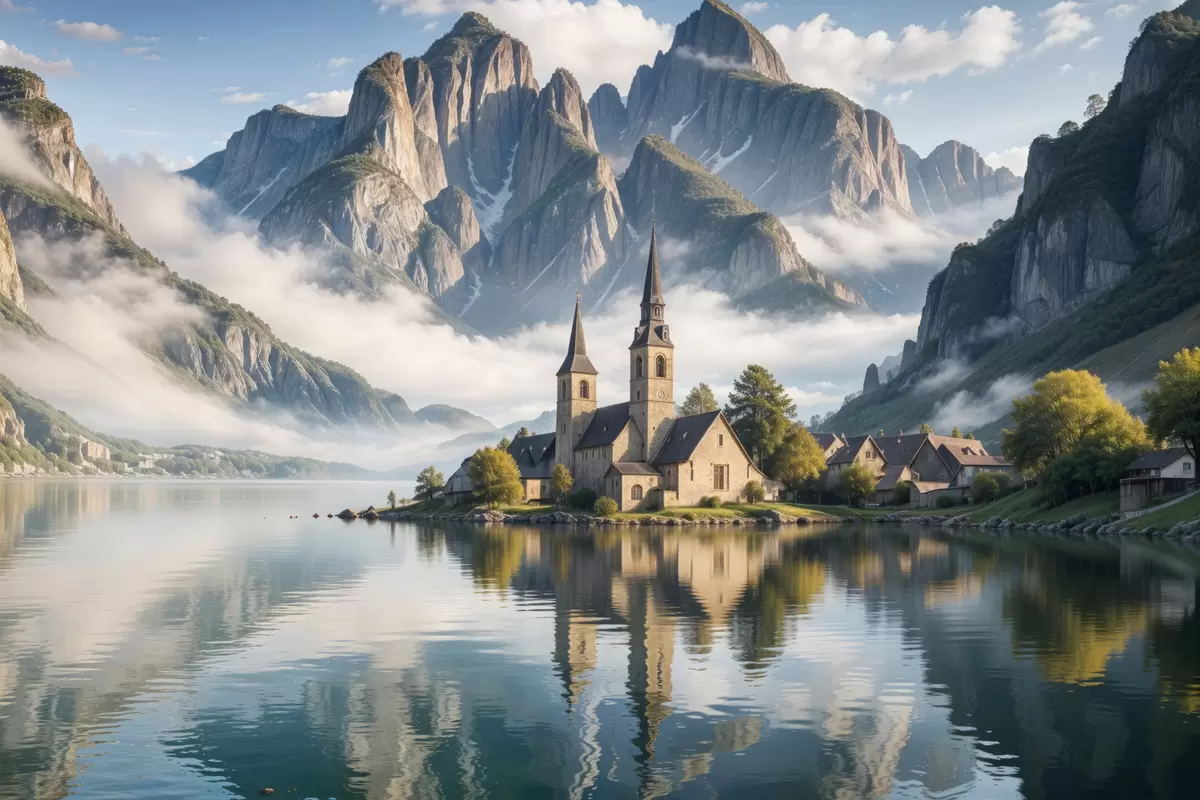 Poster Un pintoresco pueblo alpino situado junto a un lago sereno, con imponentes montañas cubiertas de nieve. f40554