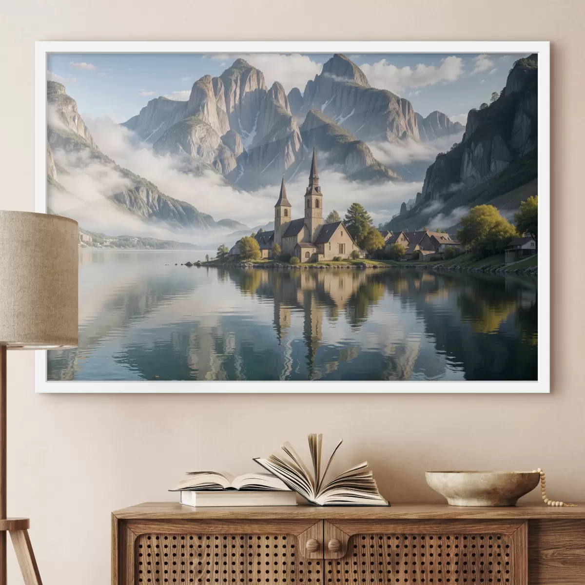 Poster Un pintoresco pueblo alpino situado junto a un lago sereno, con imponentes montañas cubiertas de nieve. Nr f40554