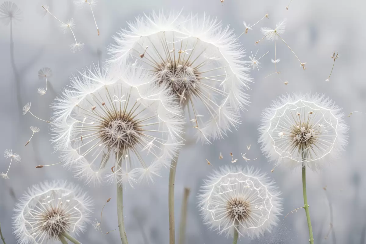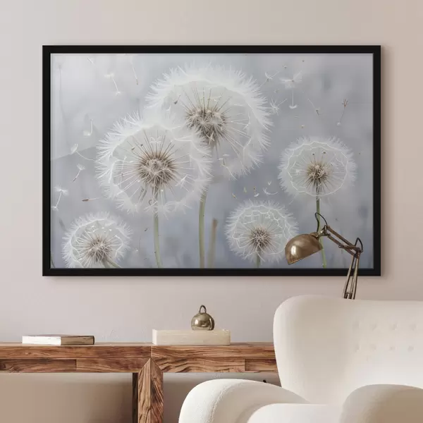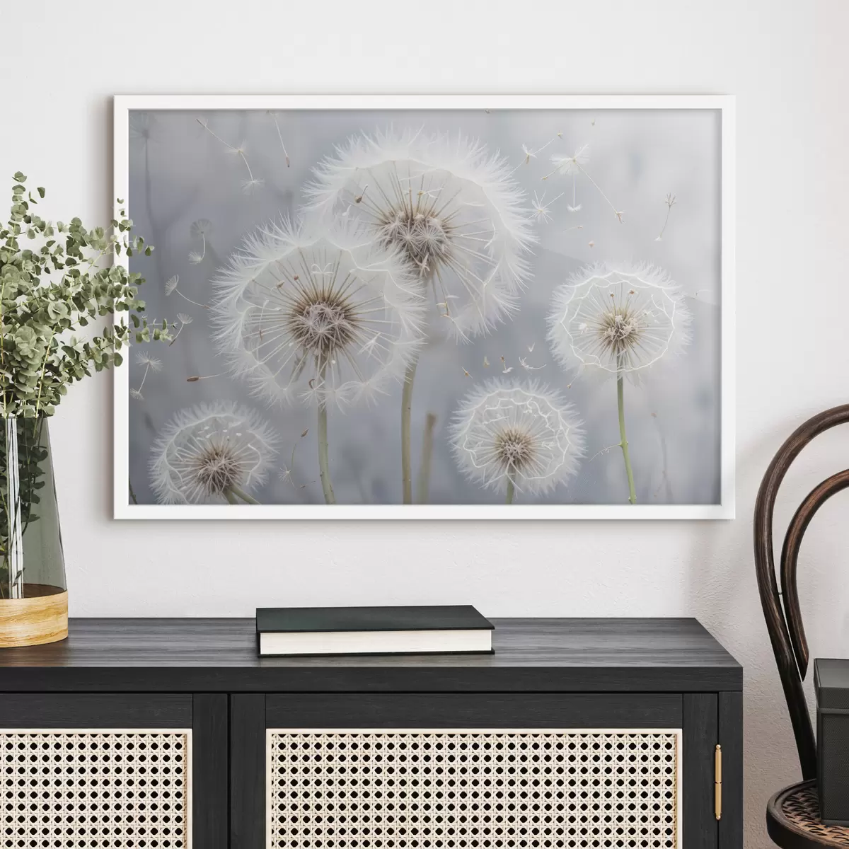 Poster Flores de diente de león blancas con semillas esponjosas sobre un fondo gris borroso f40556