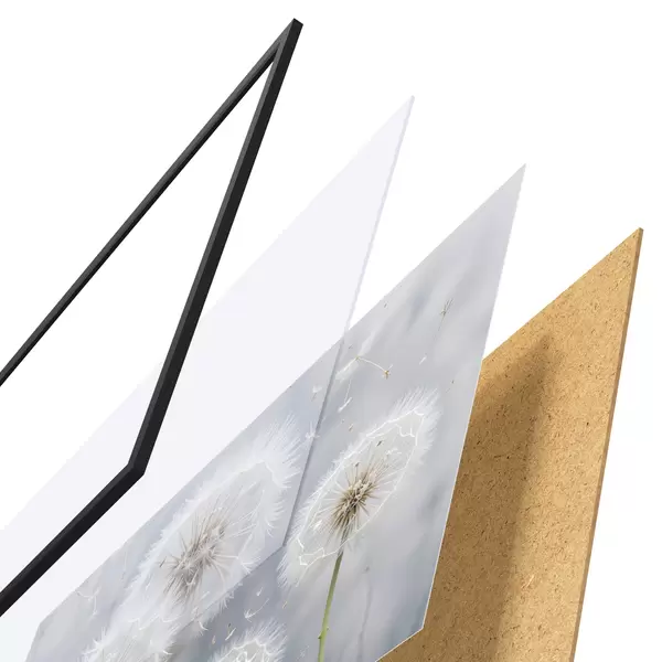El póster consta de marco, plexiglás, imagen impresa y soporte de aglomerado. El póster puede colgarse inmediatamente en la pared gracias a los soportes de la parte posterior.