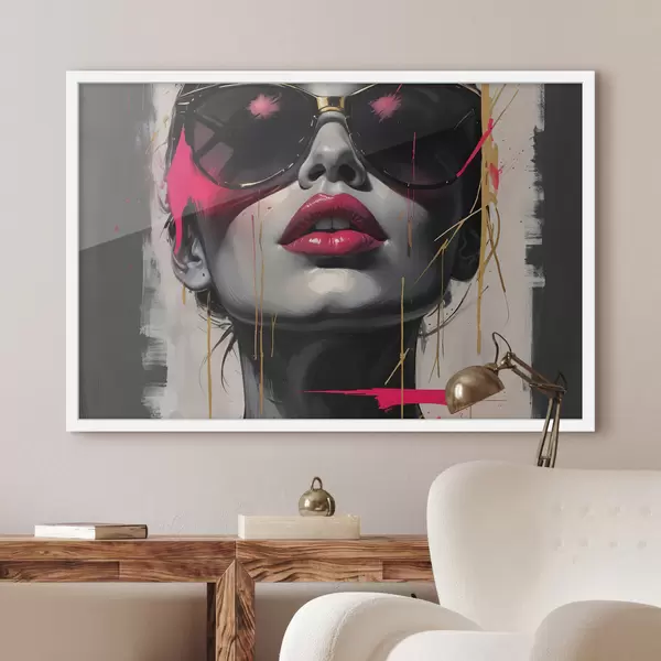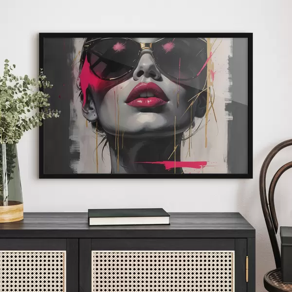 Poster Retrato abstracto de una mujer joven con gafas de sol con labios rosados y formas abstractas y salpicaduras de color rosa. f40558