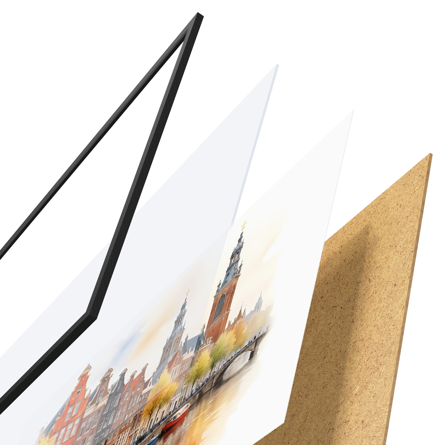 Poster Un colorido paisaje urbano de acuarela de Ámsterdam con casas tradicionales de los canales holandeses y barcos en el agua. Nr f40561